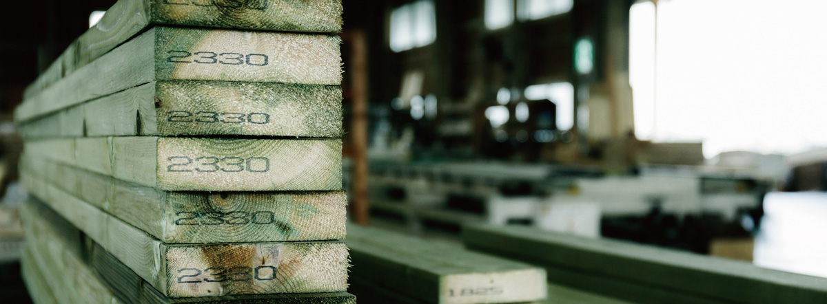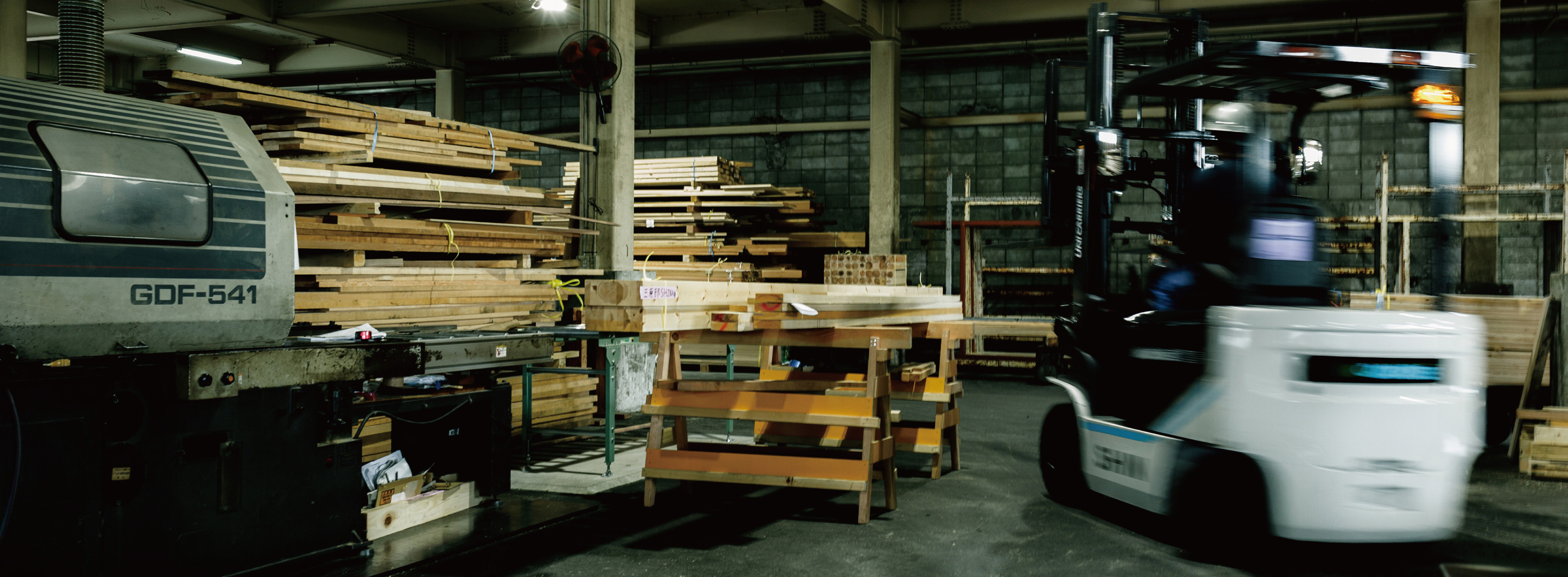 1Fでは、木材加工機で、フローリング加工、構造材の幅・厚さ決め、窓枠や敷居などの溝加工、超仕上加工など住宅の構造材の製造を行っています。 2Fでは、2×4構造材のプレカット、壁、床、屋根のパネル製造・販売を行なっています。