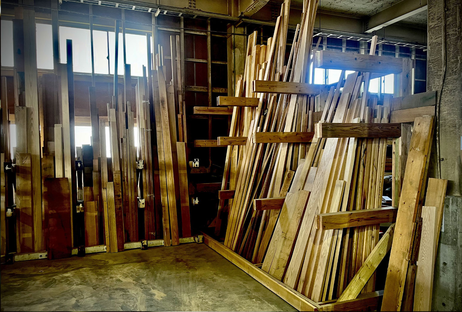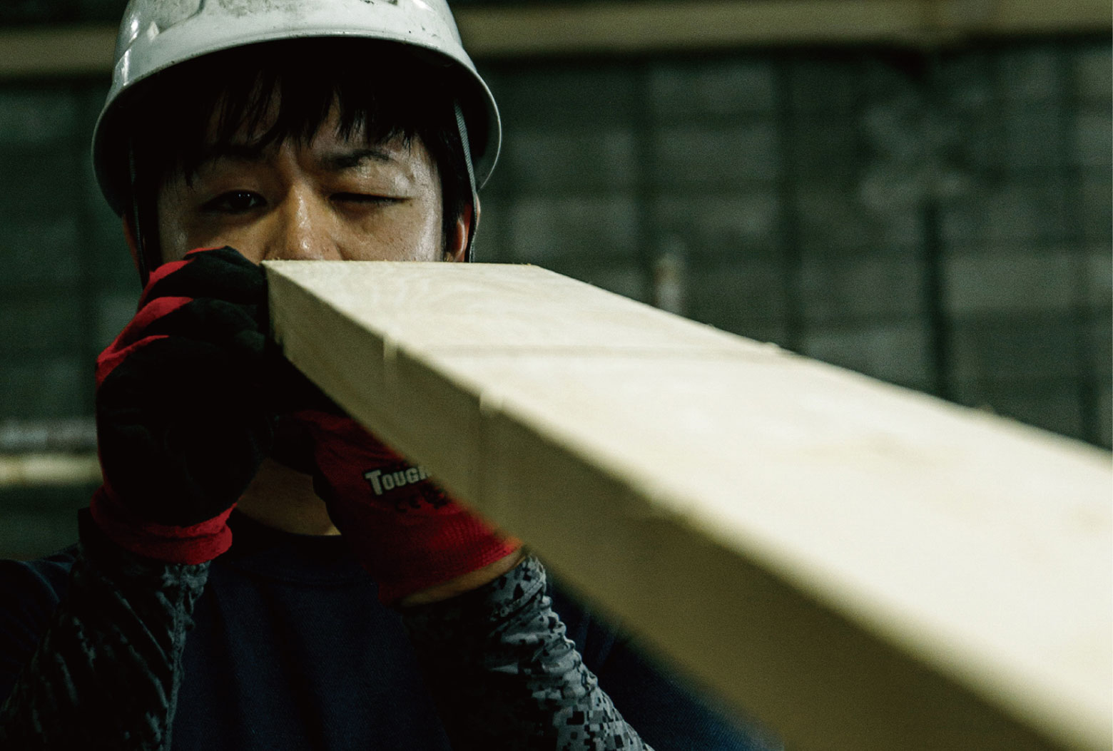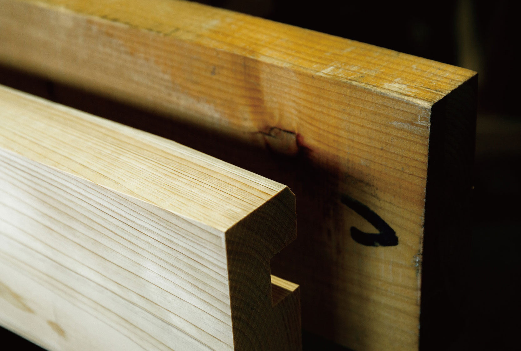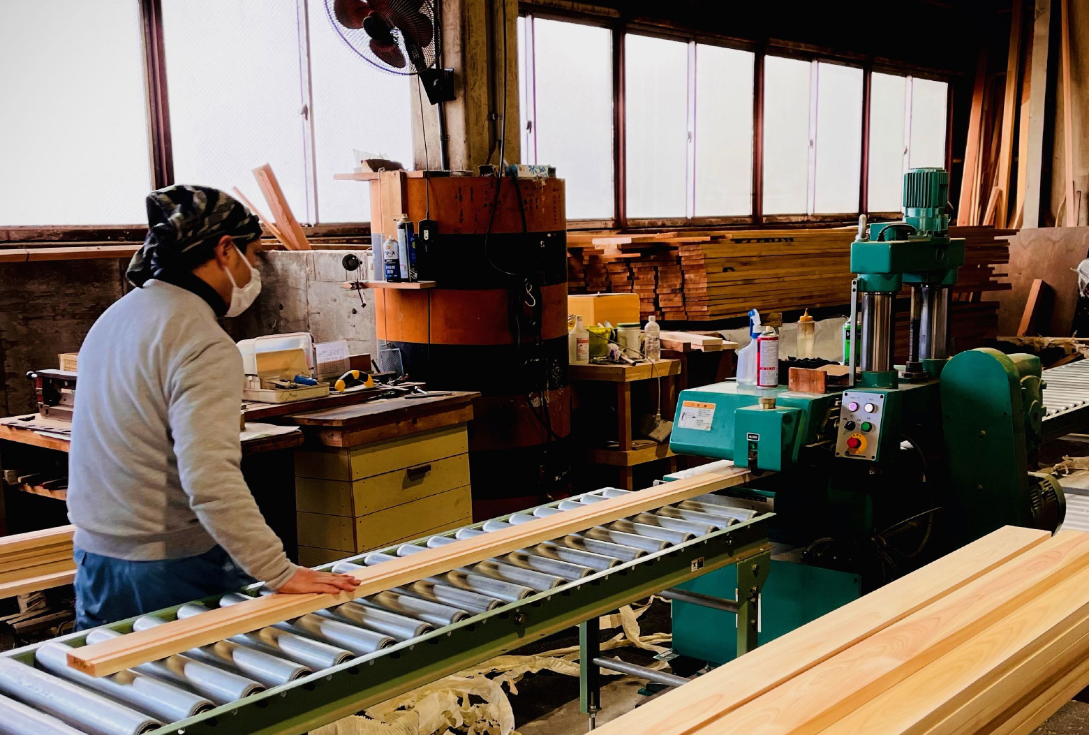 ↑1本1本加工する前に職人の目で木材の反り、ねじれ、曲がりがないか確認し、加工しています。