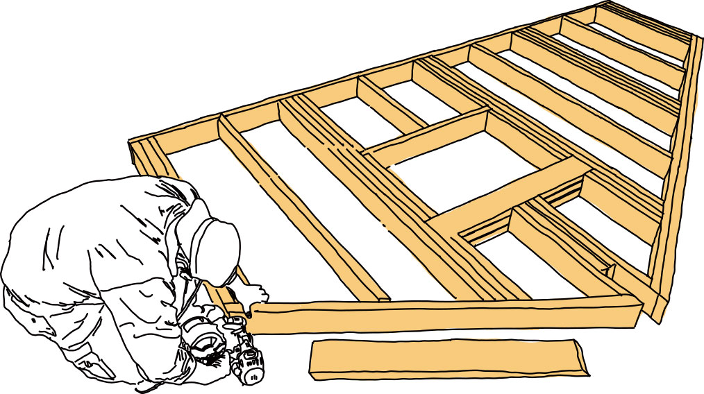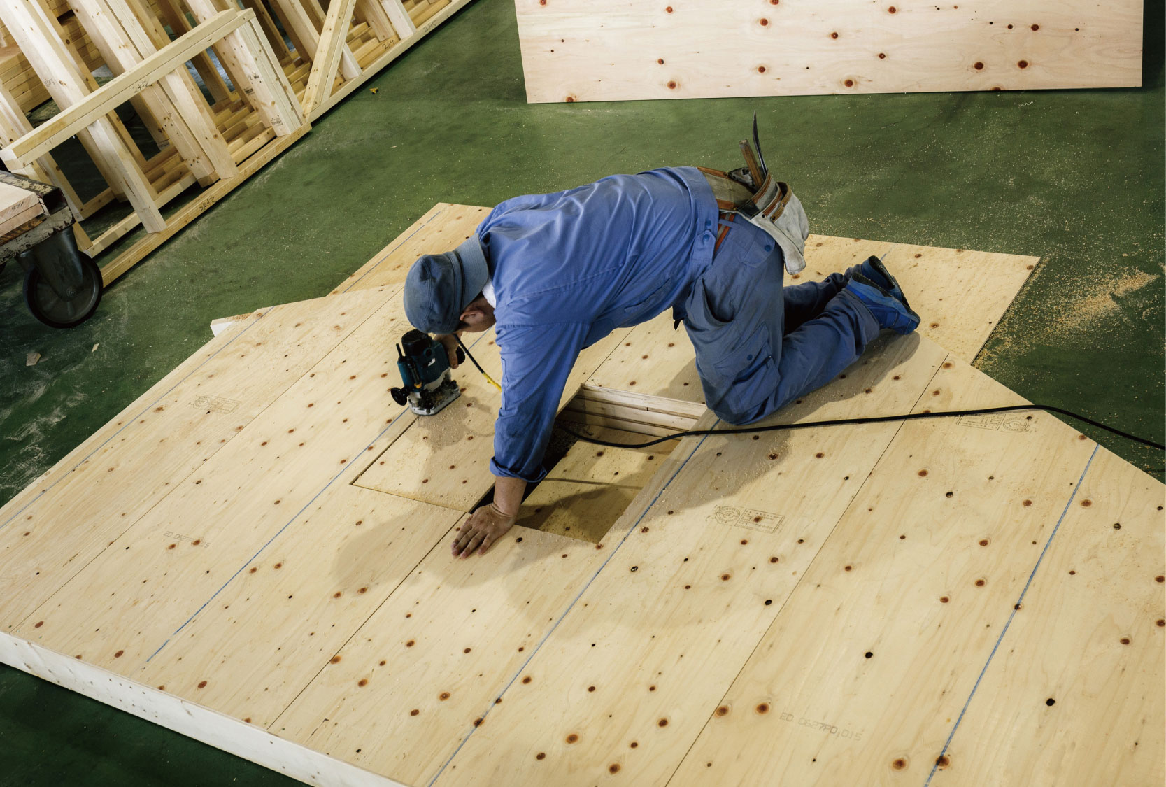 3次元トラスカットソーでプレカットした材料を組み妻壁パネルを製作し、開口部分の合板はルーターを使用し穴を開けます。