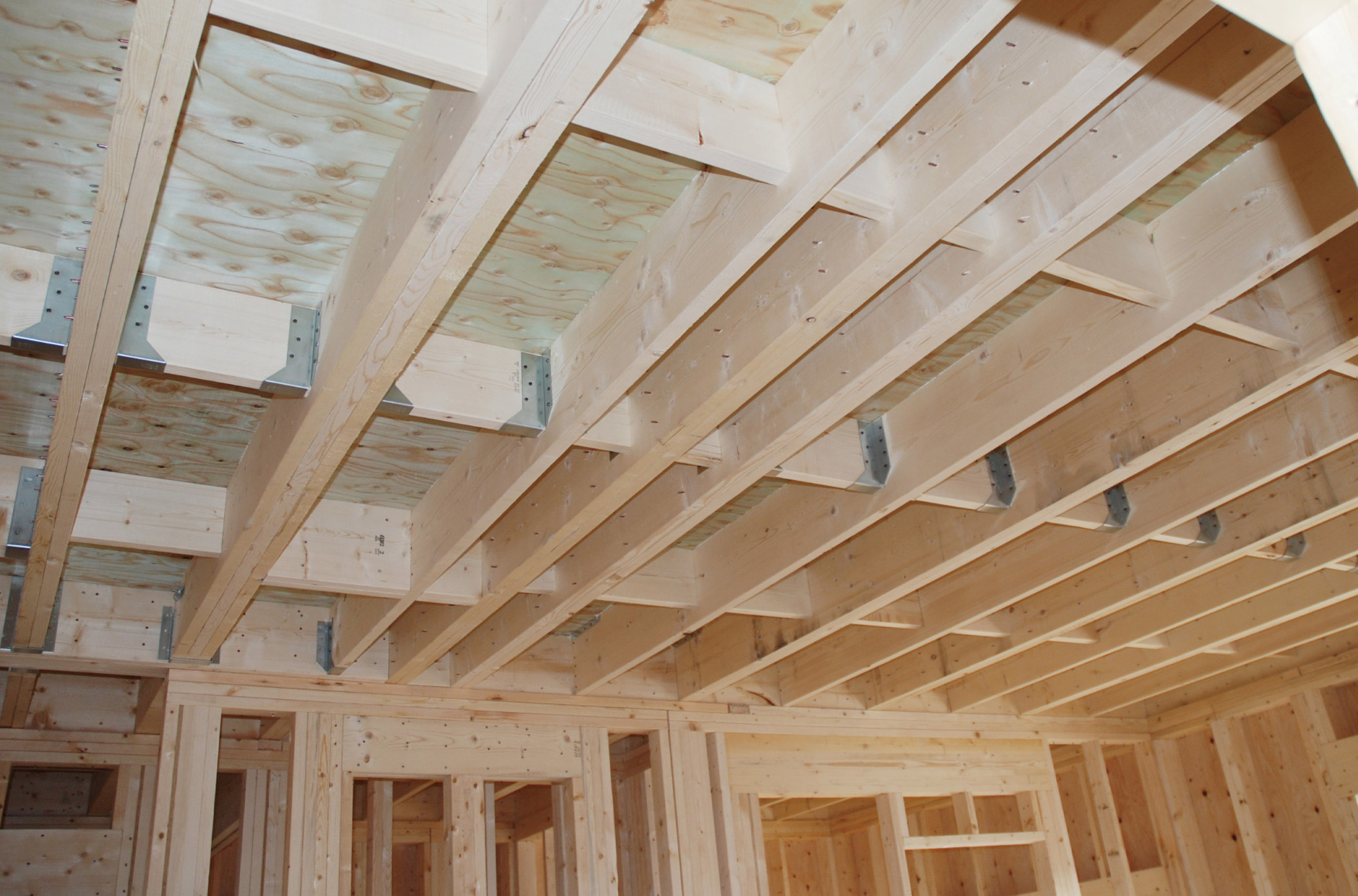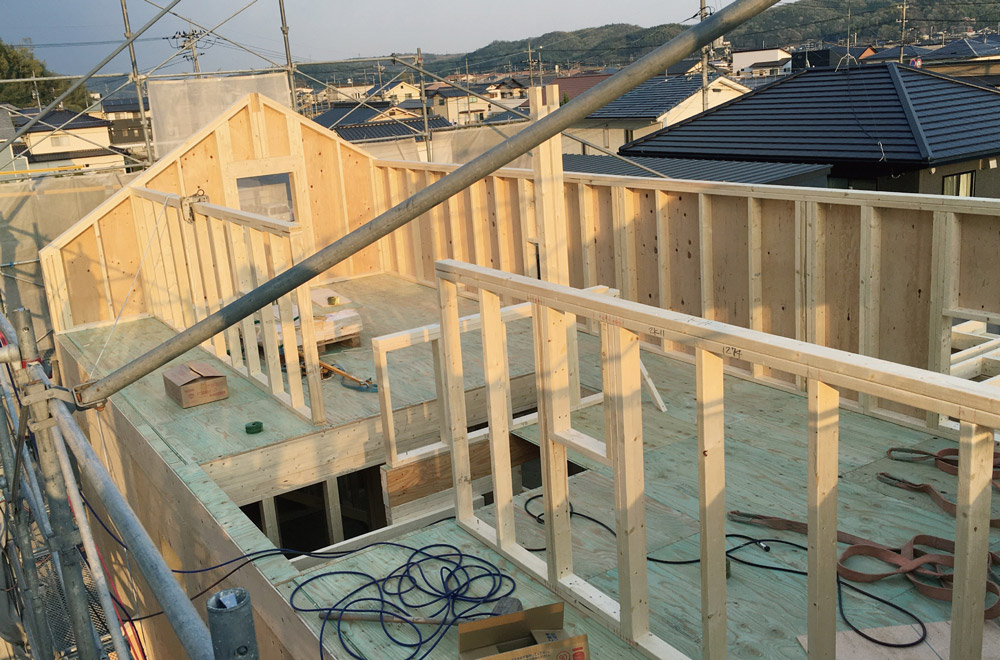 1F床の構成材は防腐・防蟻処理材料を206材使用してパネル化をしています。2F、3Fになると210材を使用し、構造上必要な部分には集成材を使用し、パネル化します。